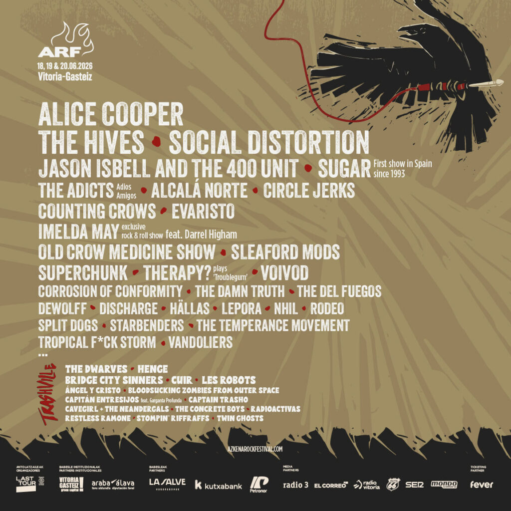 Todas estas incorporaciones se suman a los más de treinta nombres ya desvelados, en una lista encabezada por Alice Cooper y Social Distortion y con la que Vitoria-Gasteiz se convertirá en la capital del rock el próximo mes de junio. El cartel sigue con Imelda May en un show 100% RnR junto a Darrel Highman, Jason Isbell & the 400 Unit, Old Crow Medicine Show, Sleaford Mods, SUGAR, The Adicts, Evaristo, Circle Jerks, Corrosion of Conformity, Therapy?, The Damn Truth, The Del Fuegos, Discharge, Split Dogs, Starbenders, Tropical Fuck Storm, Voivod, Rodeo y Nhil… y aún quedan artistas por confirmar. Además, ya se ha desvelado también la programación completa de la carpa Trashville, incluyendo a The Dwarves, Bridge City Sinners, Cuir o Henge, encargados de representar la faceta más visceral del festival.